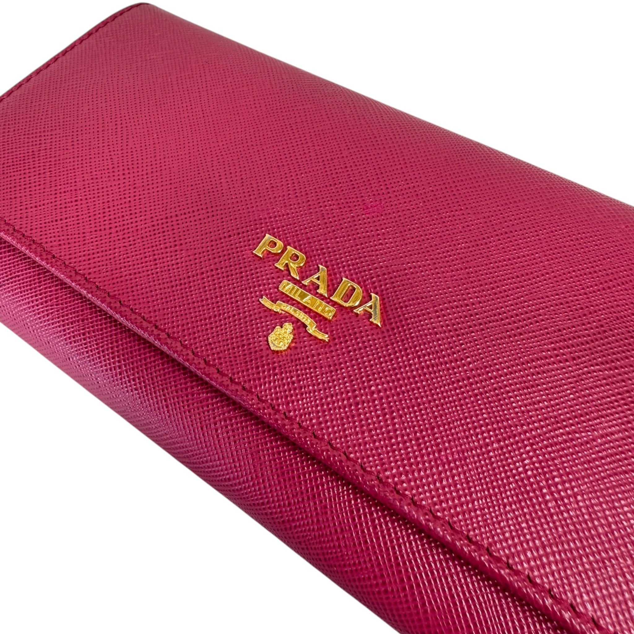 Elevate your accessory game with the PRADA Pink Saffiano Leather Continental Flap Wallet, a stylish and practical choice for any occasion.