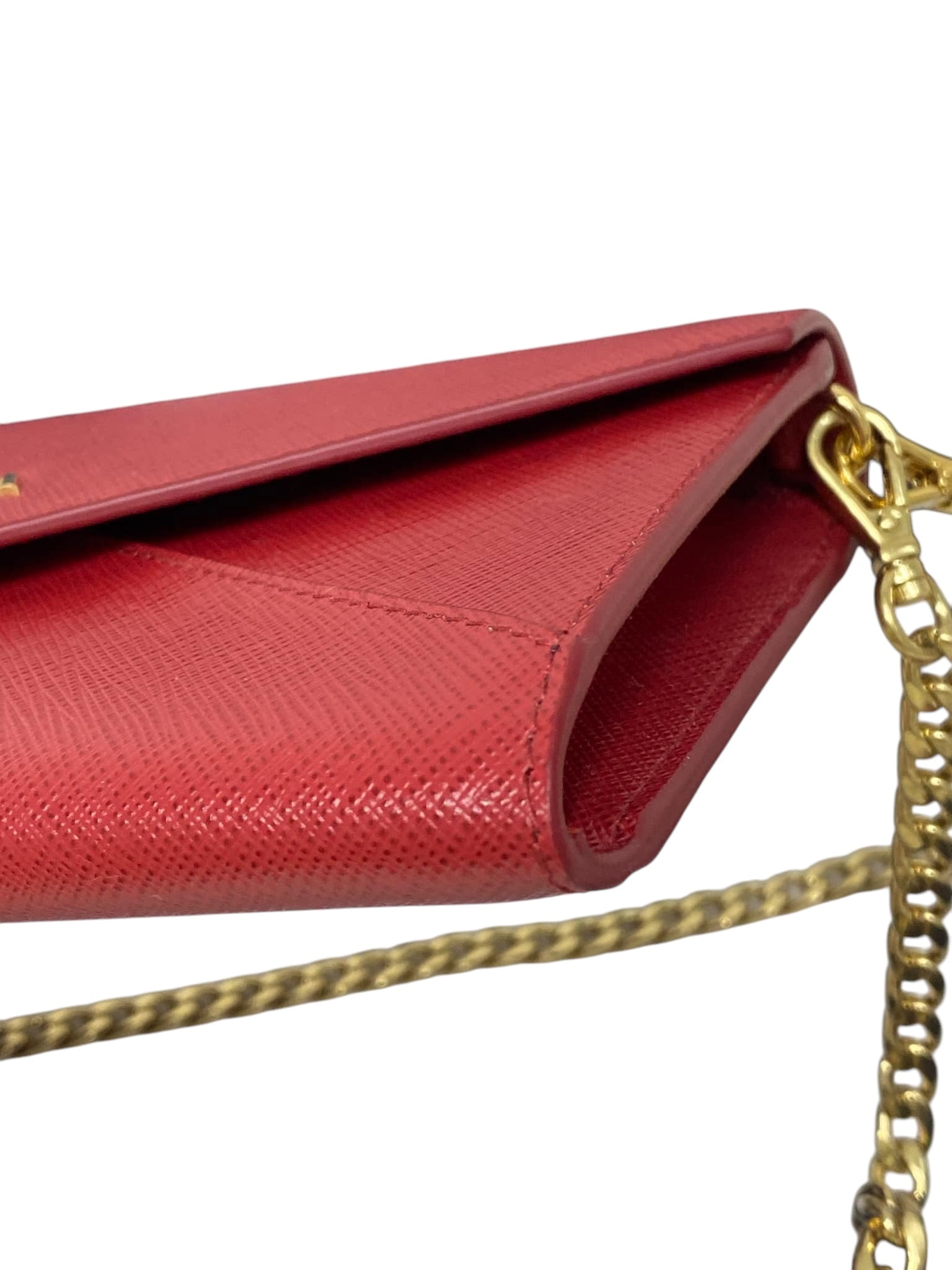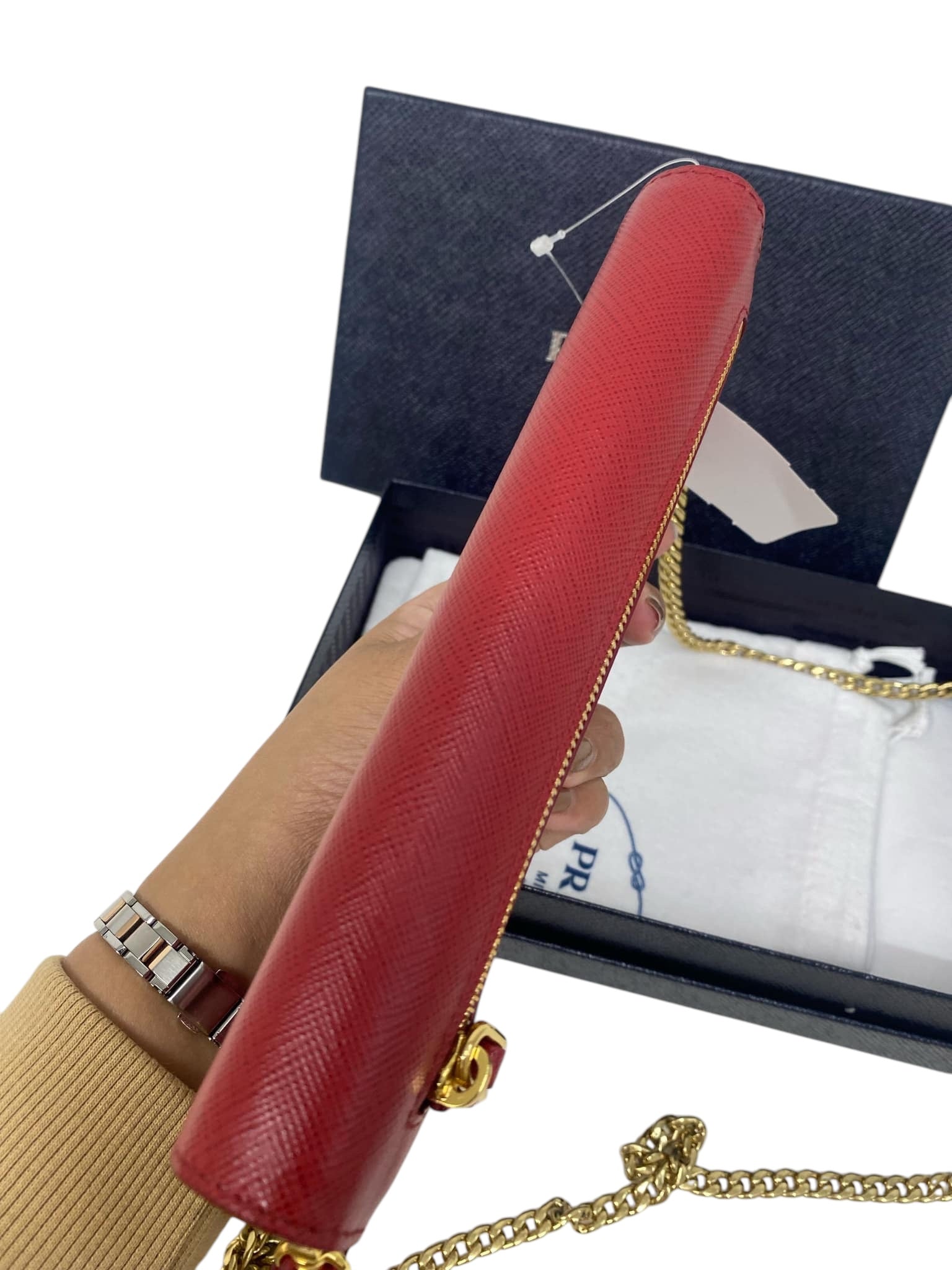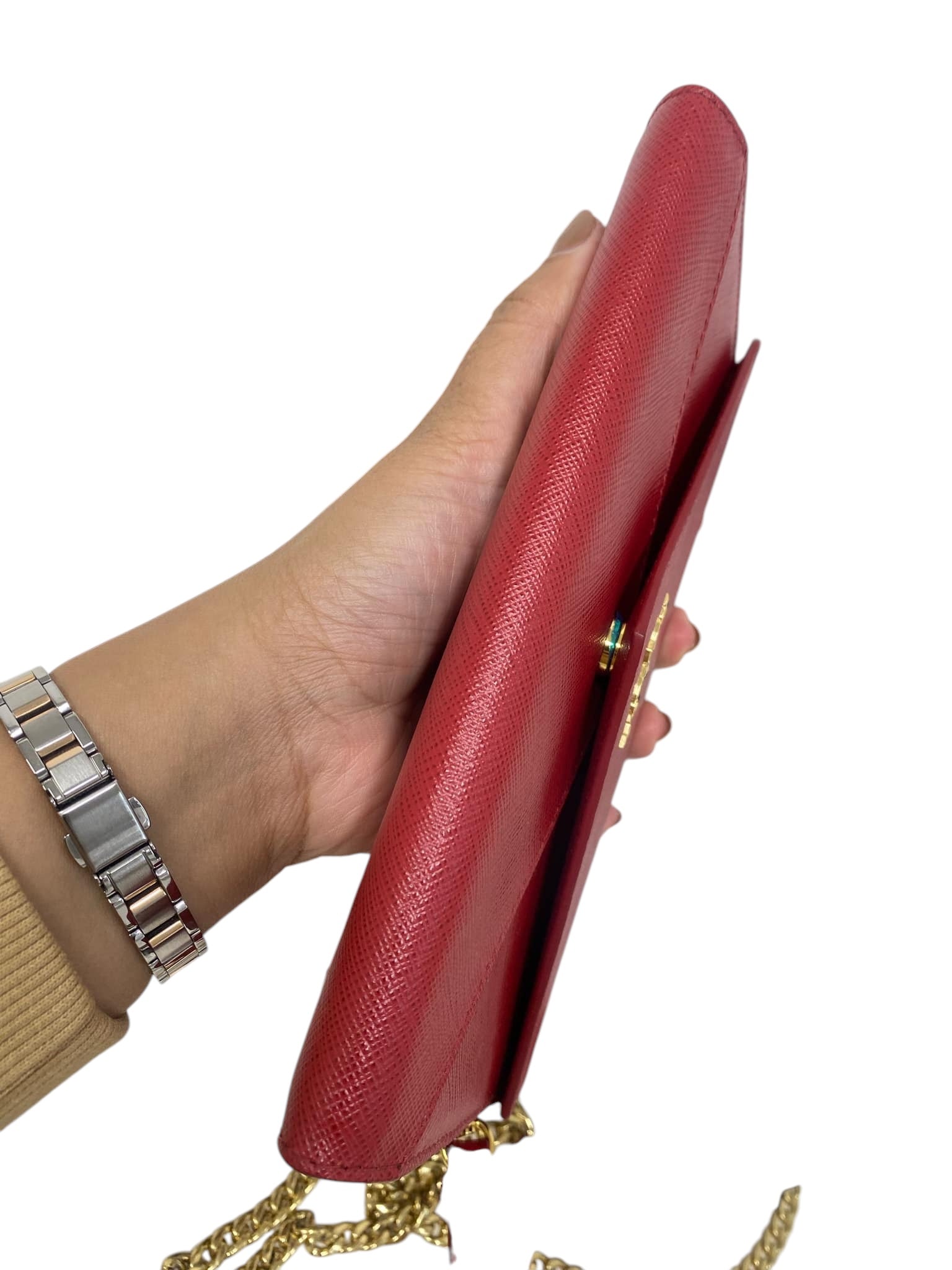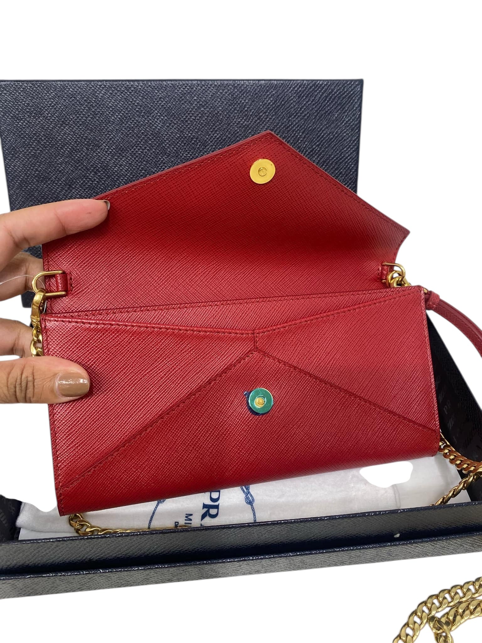 This Pre-Owned Prada Red Saffiano Leather Envelope Wallet On Chain is a stylish bag in excellent condition, with only a small dirt mark on the edge.