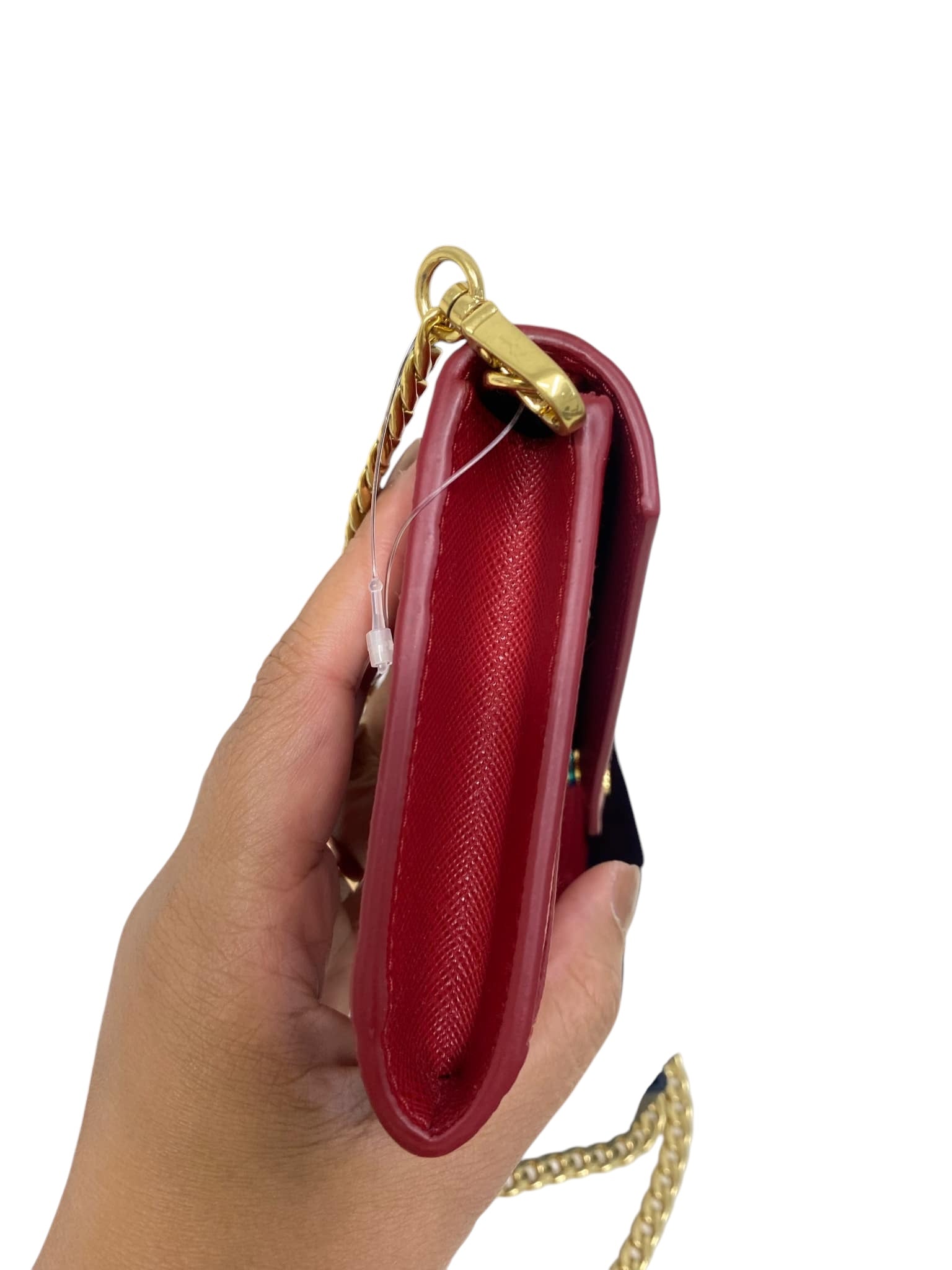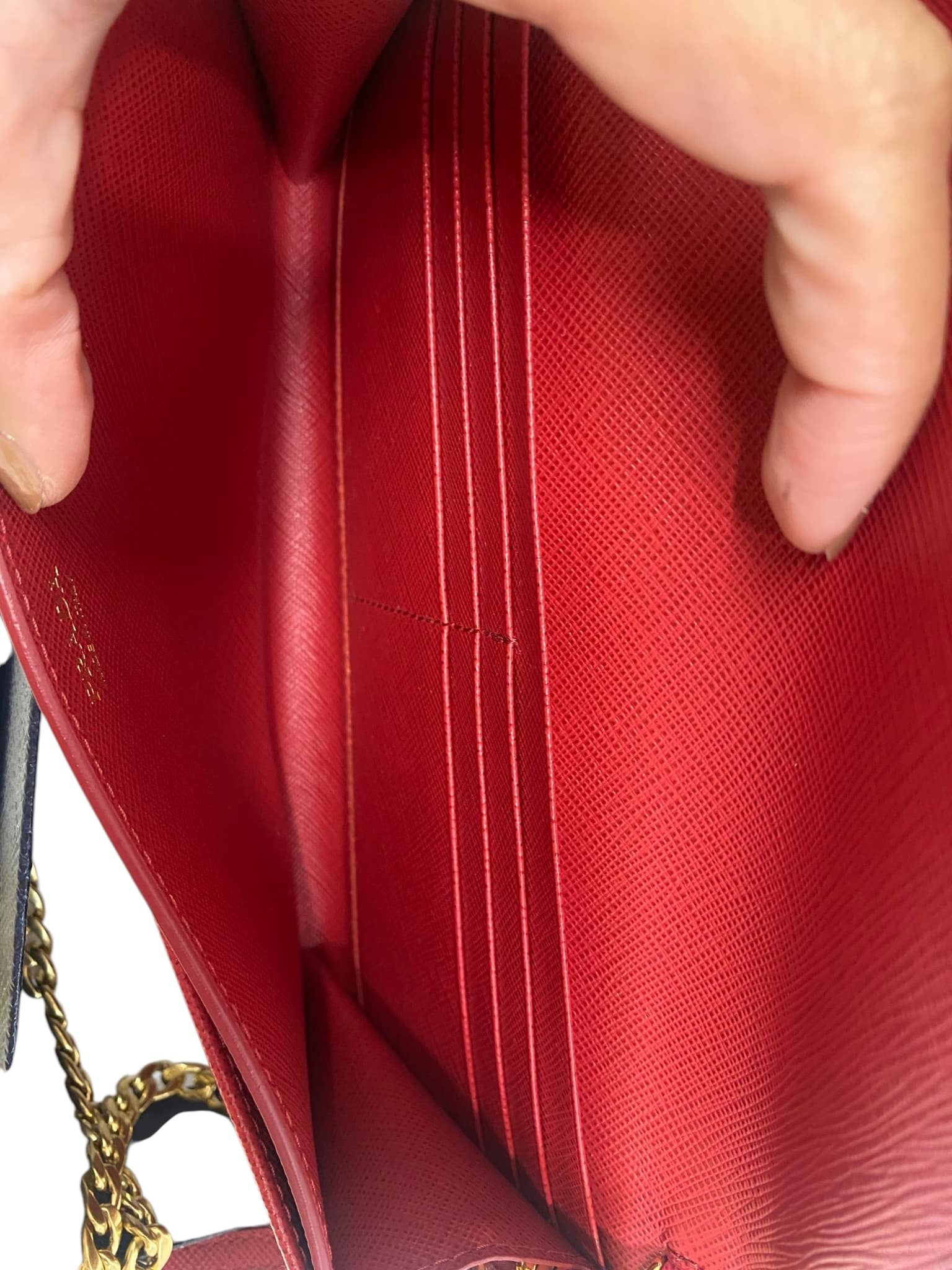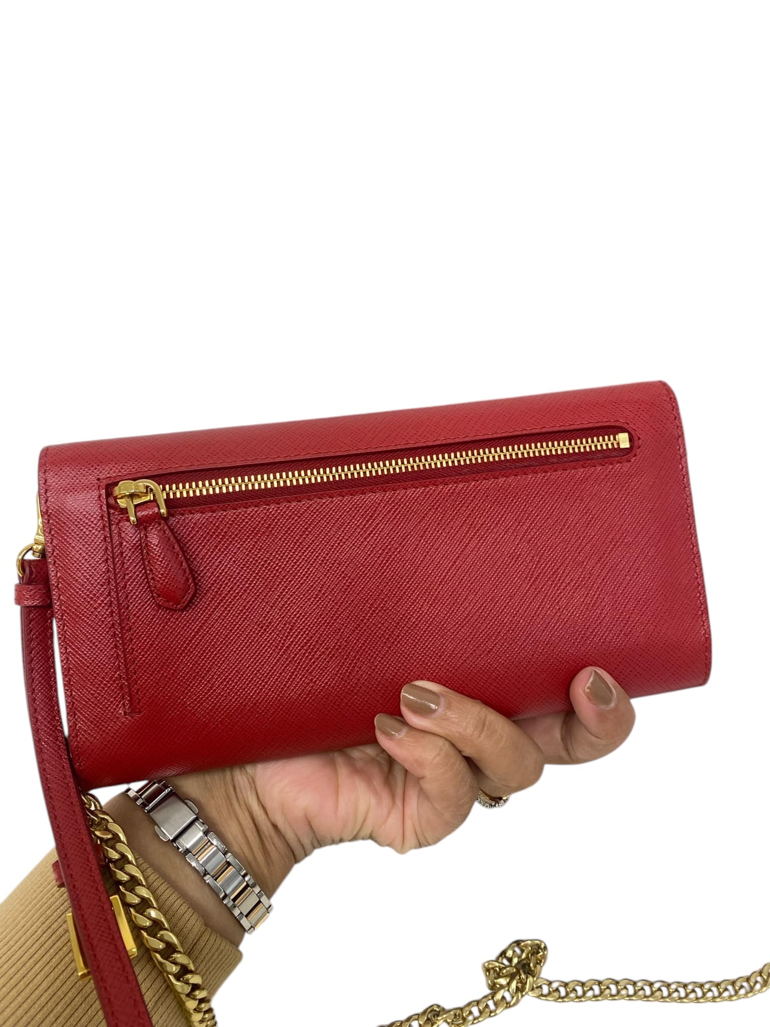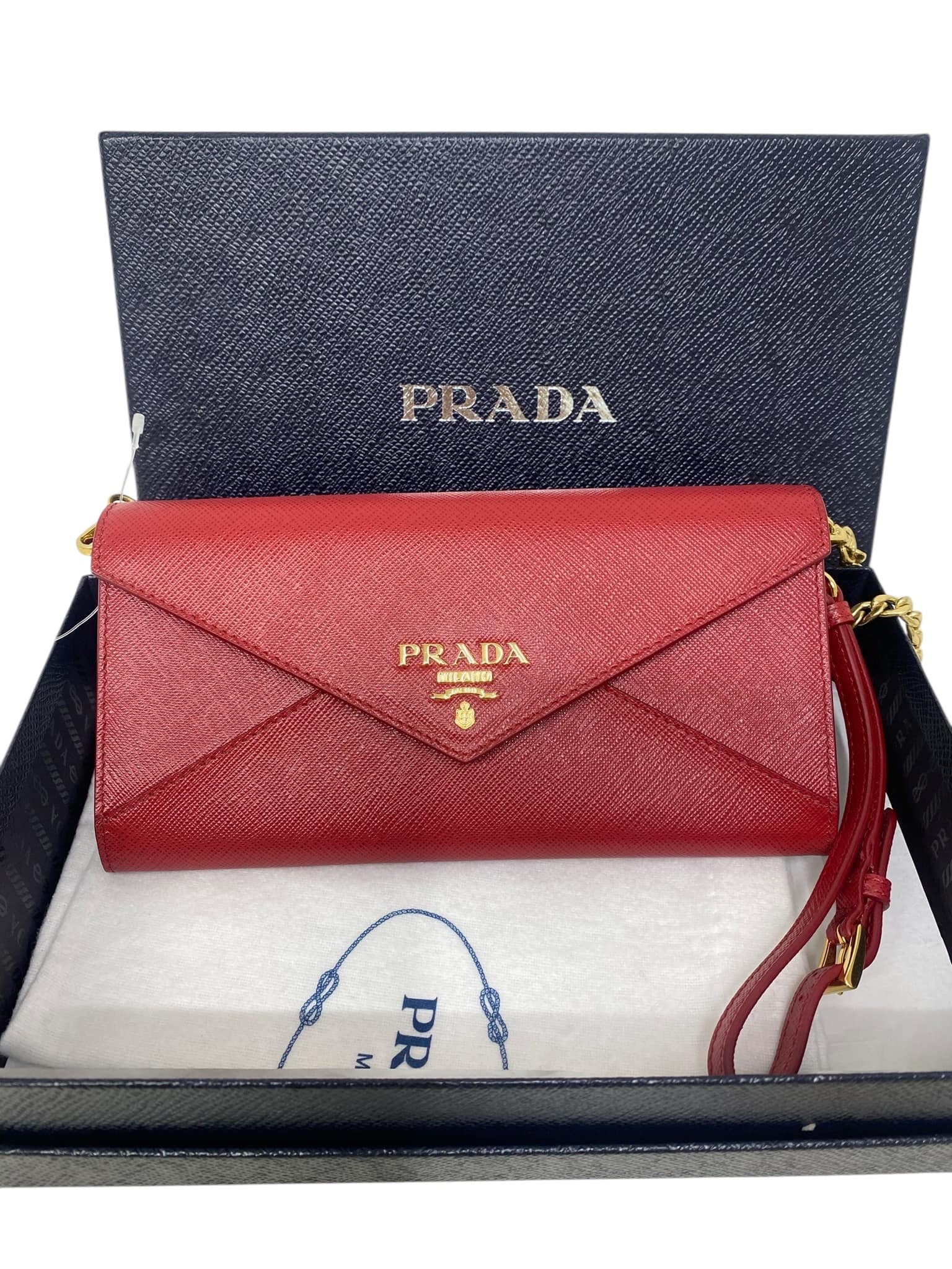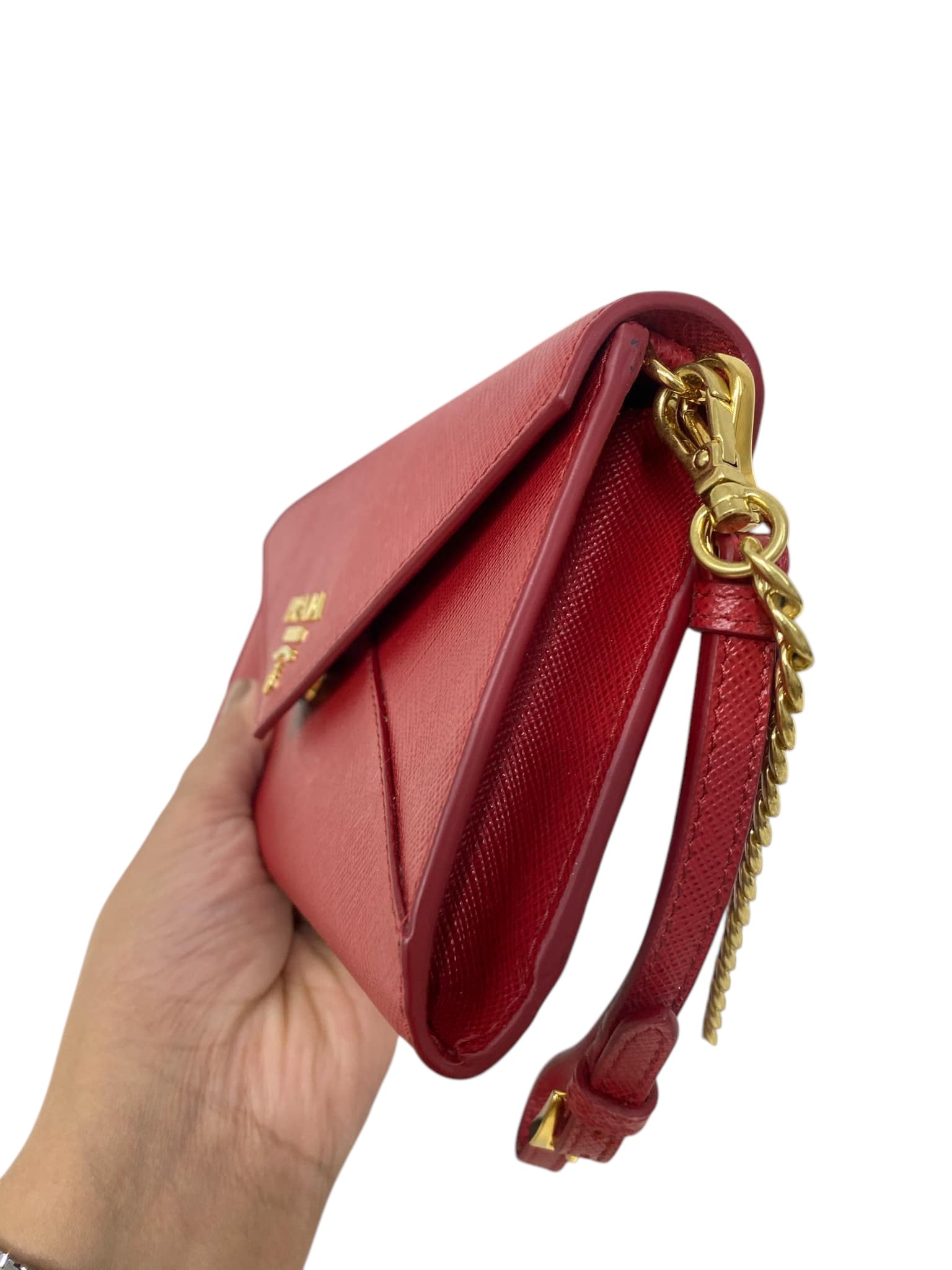 This Pre-Owned Prada Red Saffiano Leather Envelope Wallet On Chain is a stylish bag in excellent condition, with only a small dirt mark on the edge.