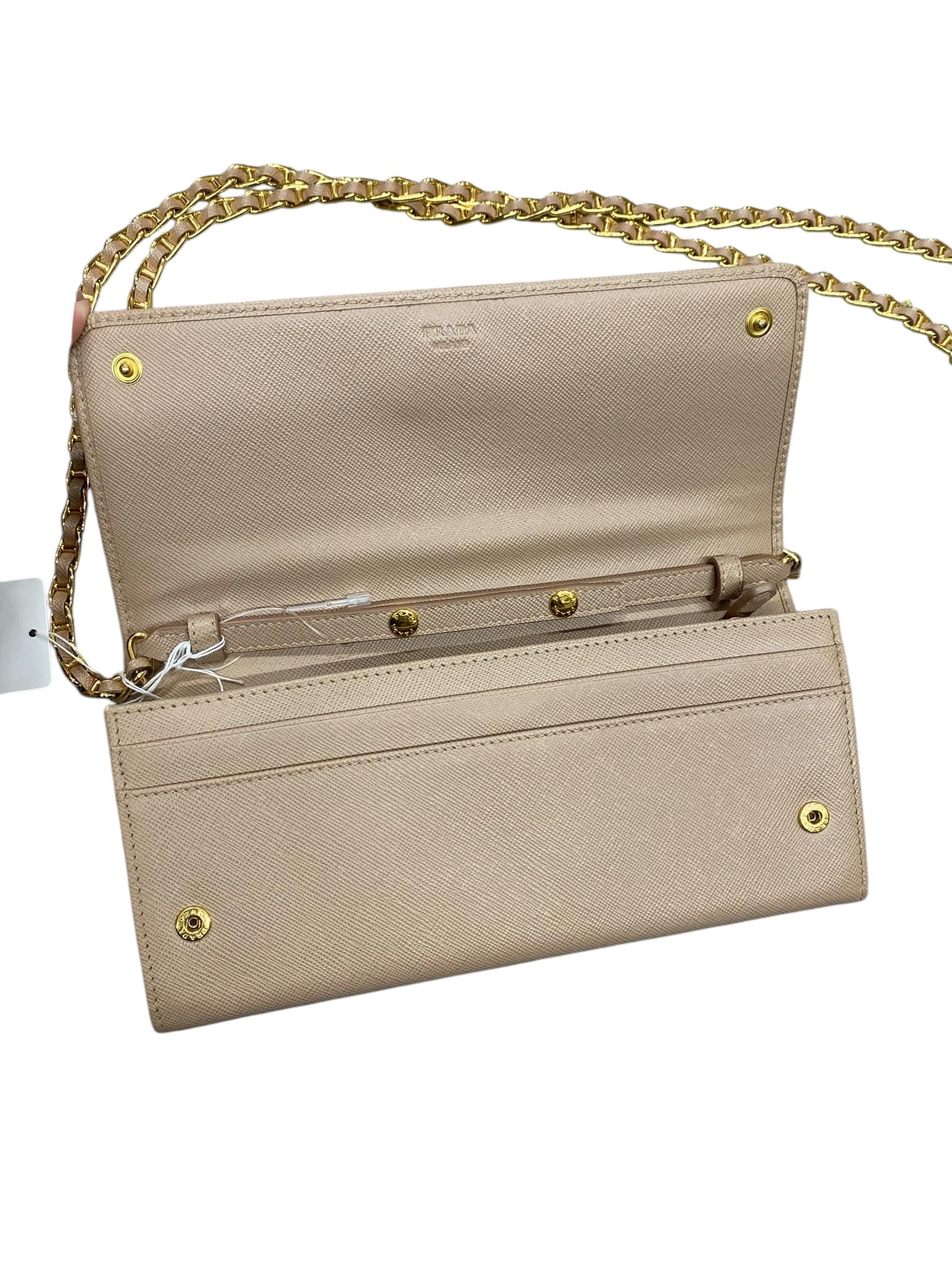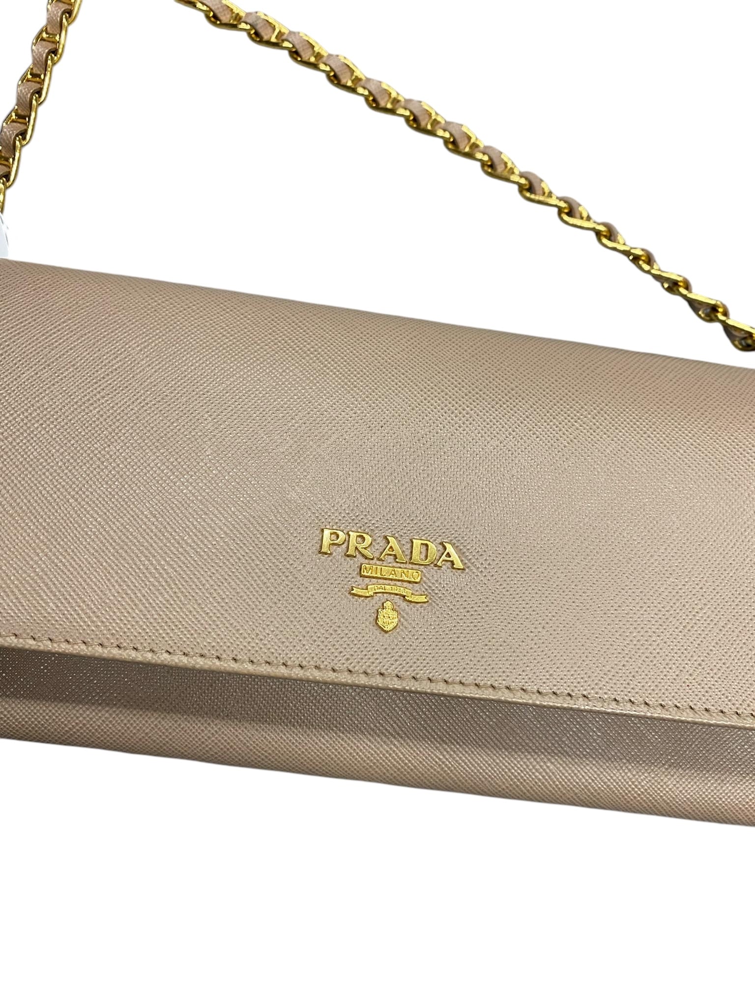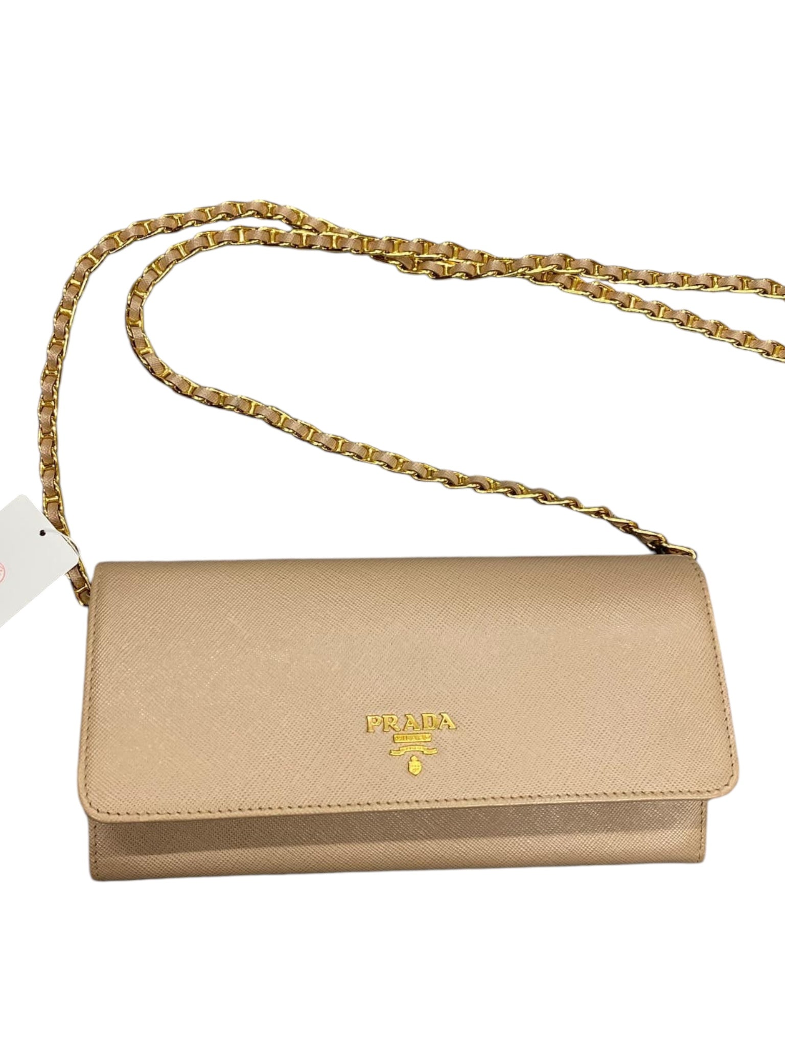 This PRADA Saffiano Metal Oro Wallet on a Chain Cammeo Crossbody Bag is a luxurious accessory perfect for any occasion.