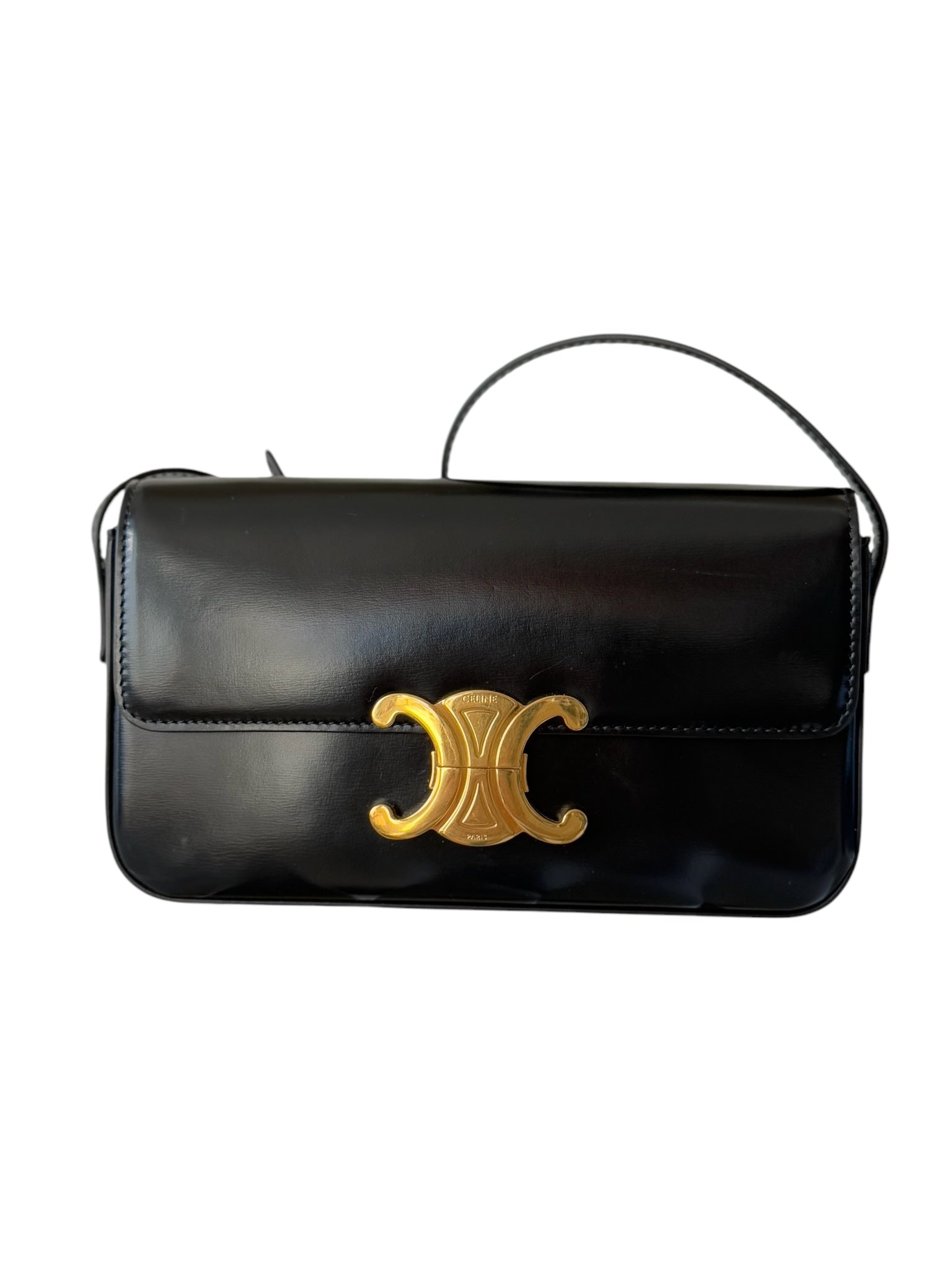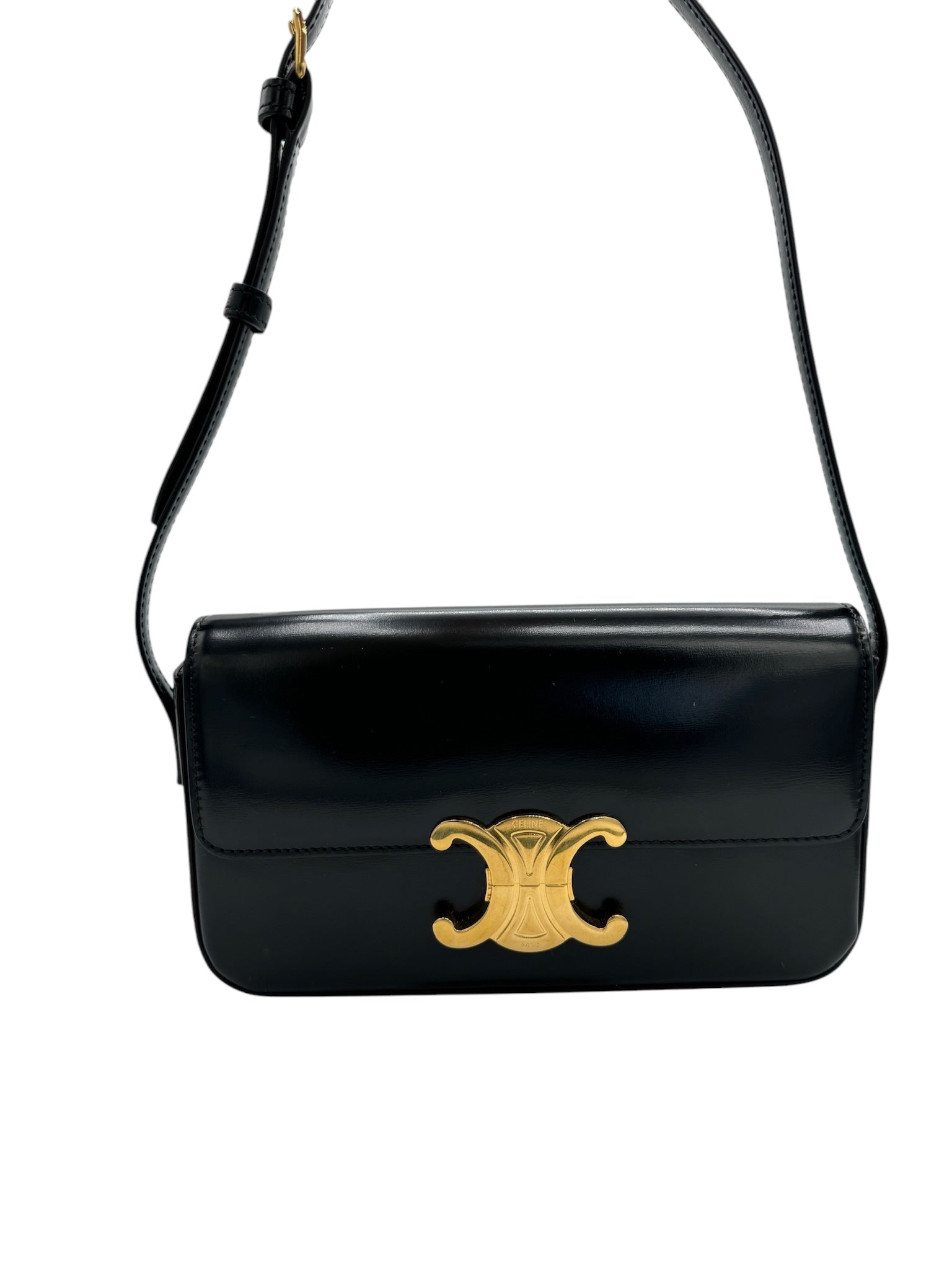 Elevate your accessory game with the Celine Triomphe Black Shining Calfskin Shoulder Bag, where style meets functionality.