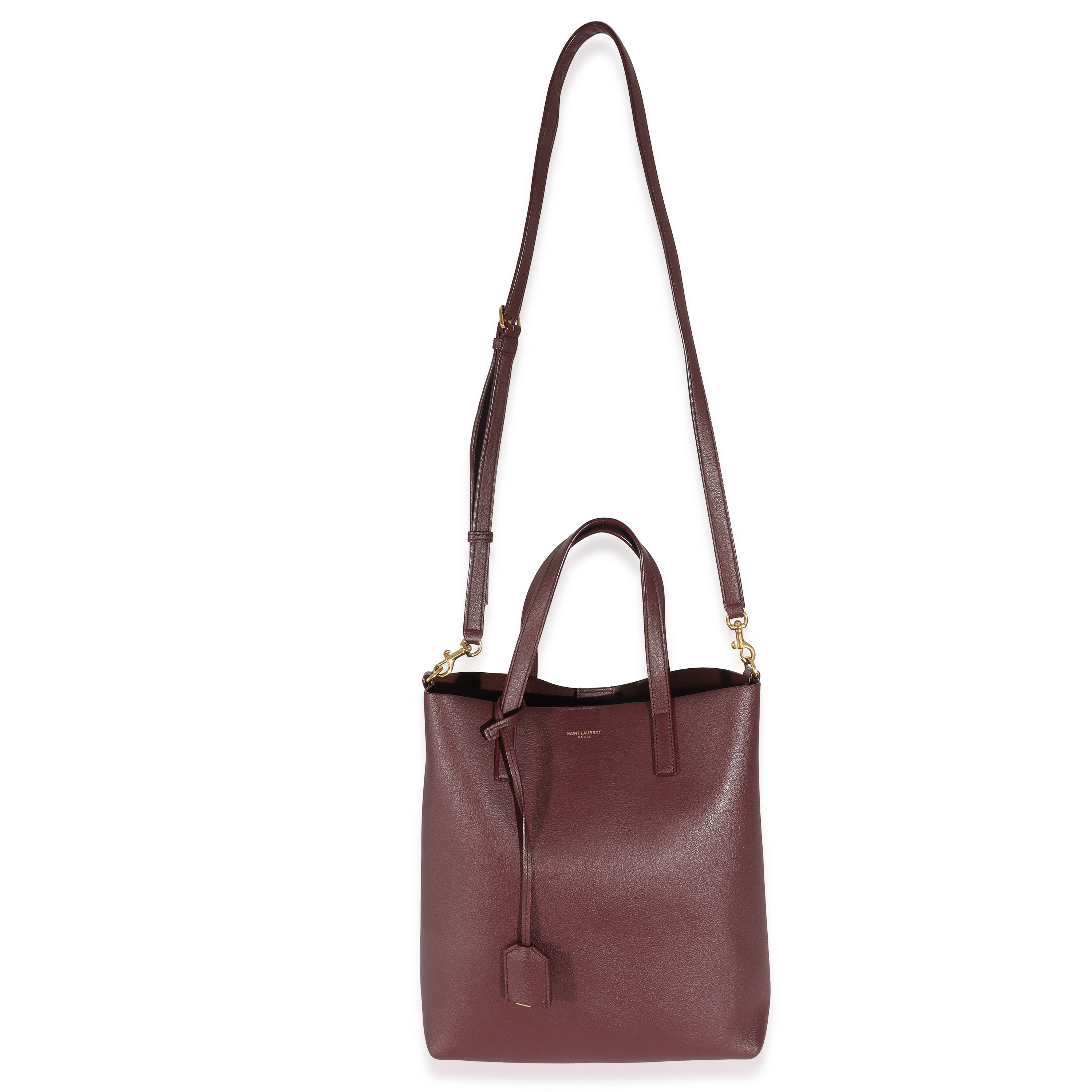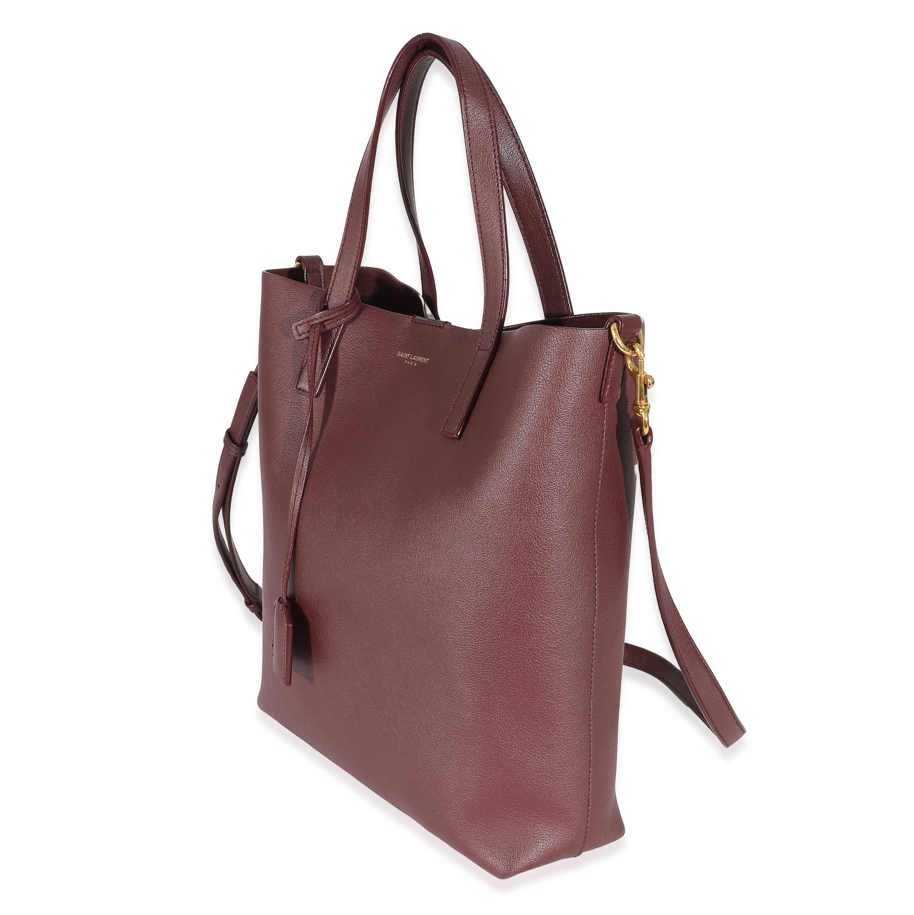 This luxurious SAINT LAURENT Toy N/S Shopping Tote is crafted from burgundy calfskin leather and features a detachable charm. It has a 5.5" to 19" handle drop, and has a roomy interior with a 9.5" width, 11" height, and 3" depth. This bag is in good condition, made in Italy, and comes with removable straps.