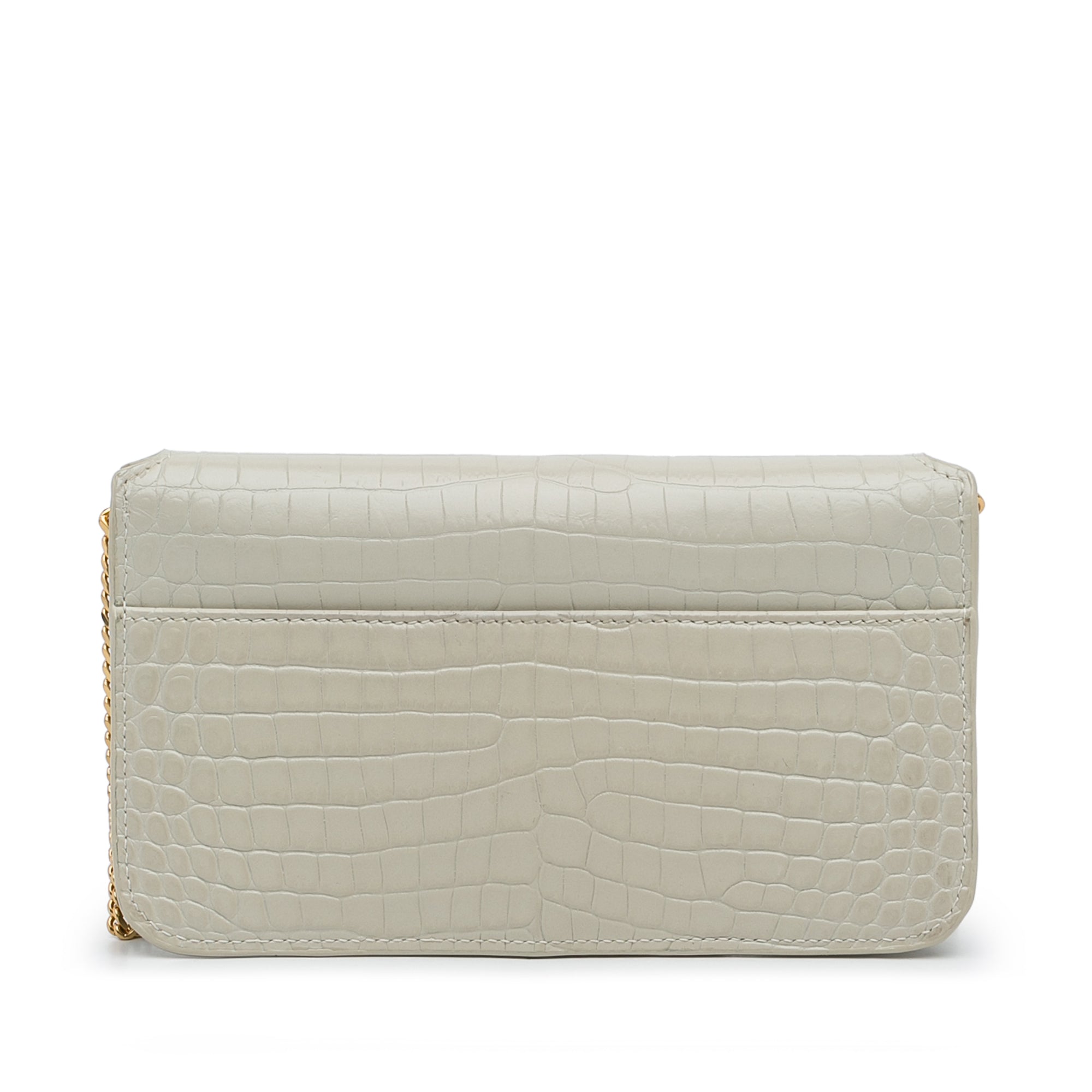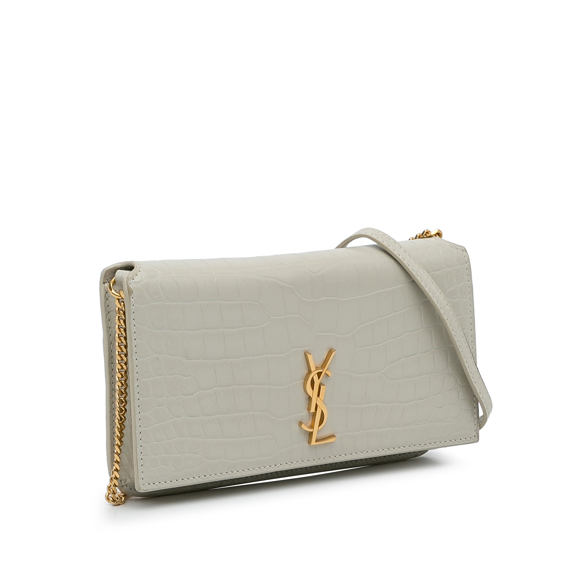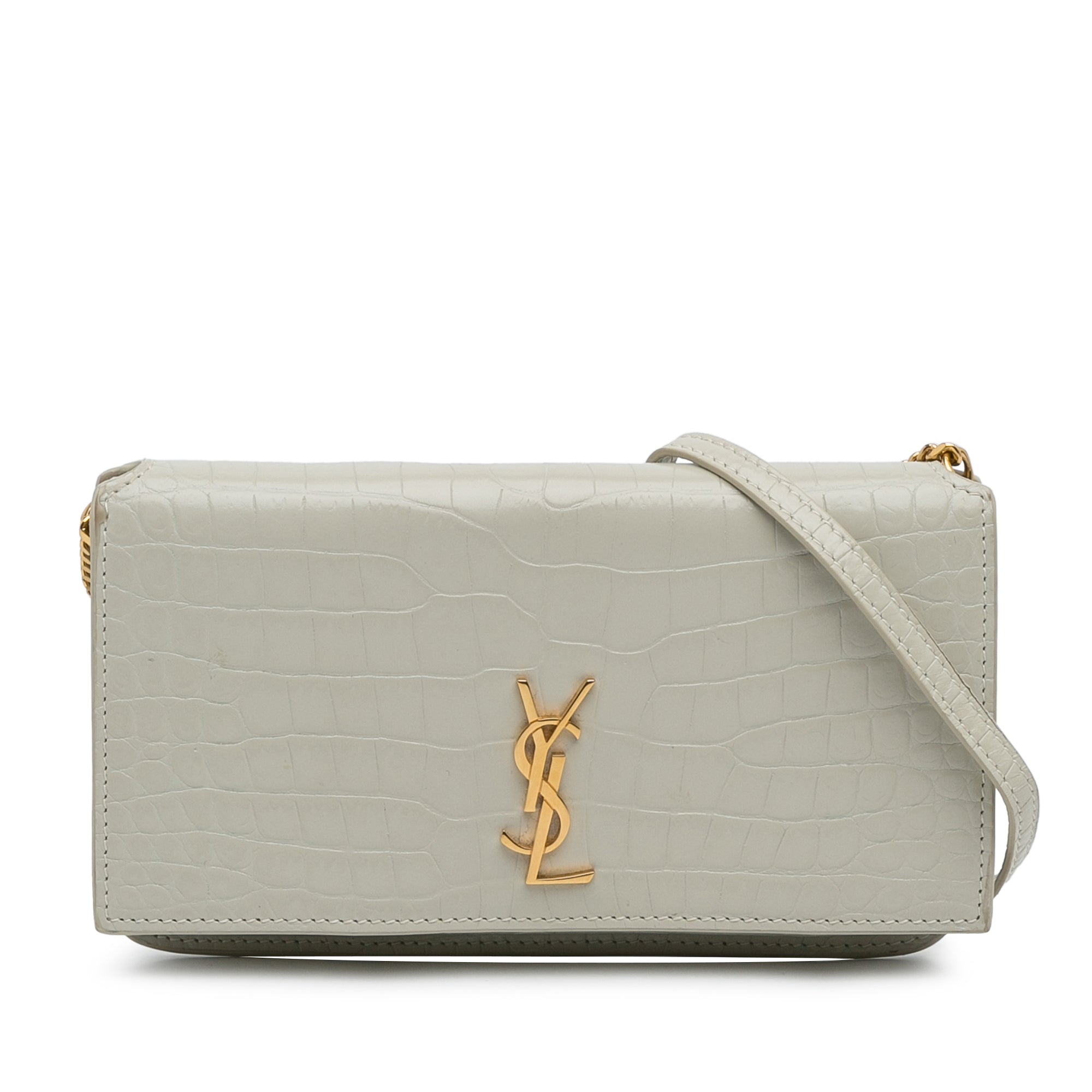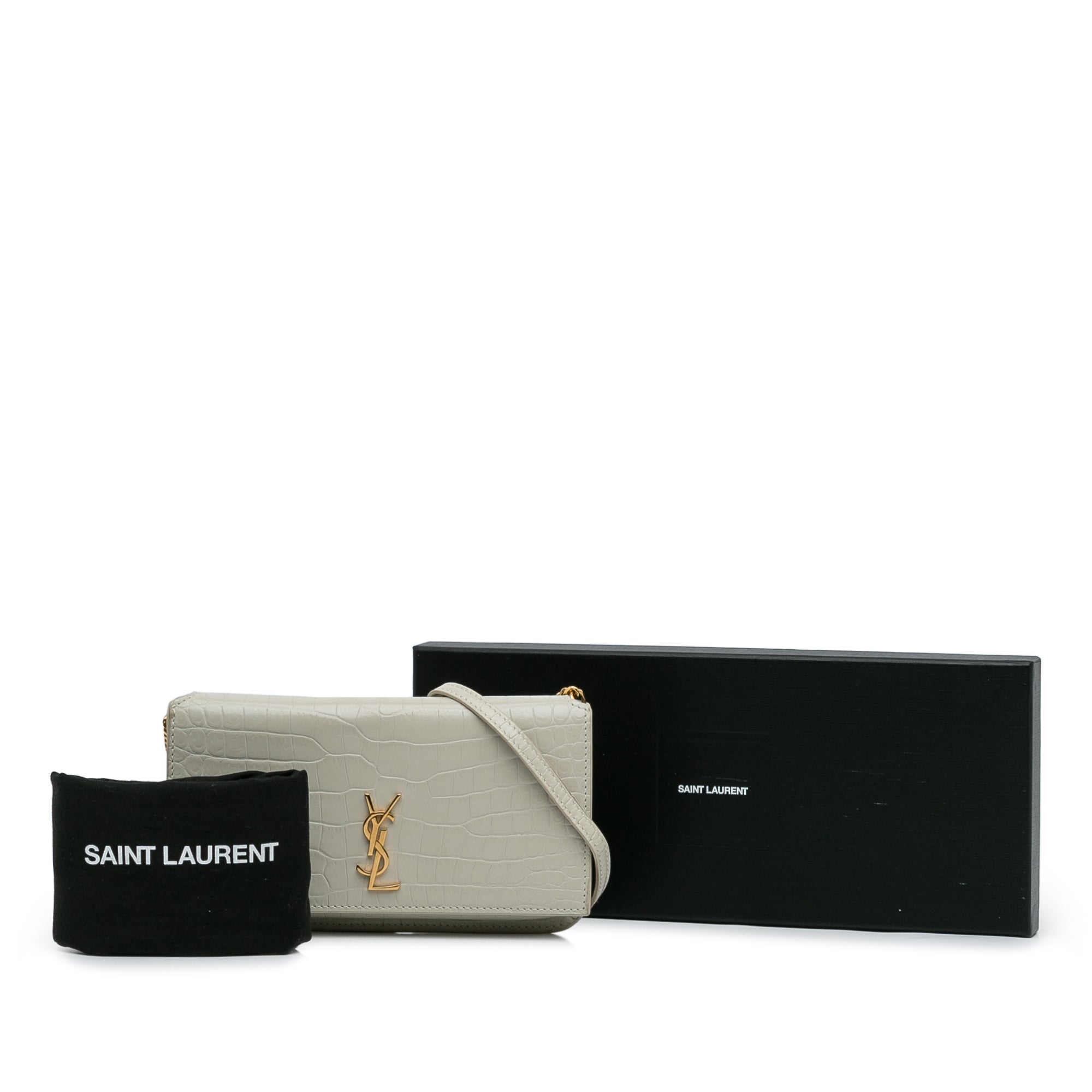Expertly crafted from luxurious croc-embossed leather, the SAINT LAURENT Monogram Phone Holder combines elegance and functionality. The chain shoulder strap allows for hands-free carrying, while the exterior slip pocket provides easy access to your phone. The front flap closure keeps your device secure, making this a must-have accessory.
