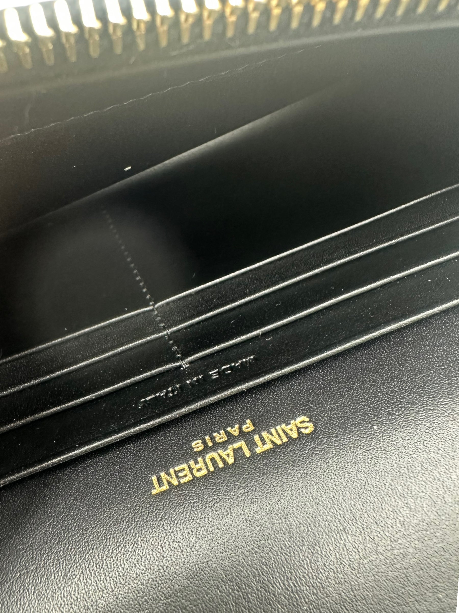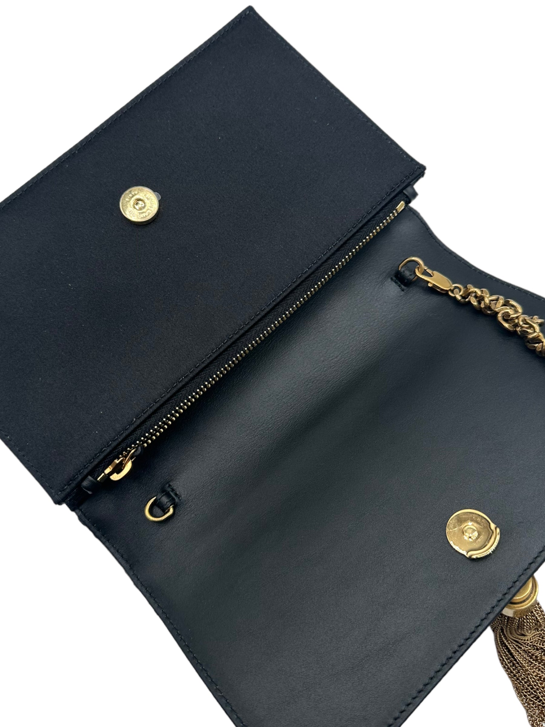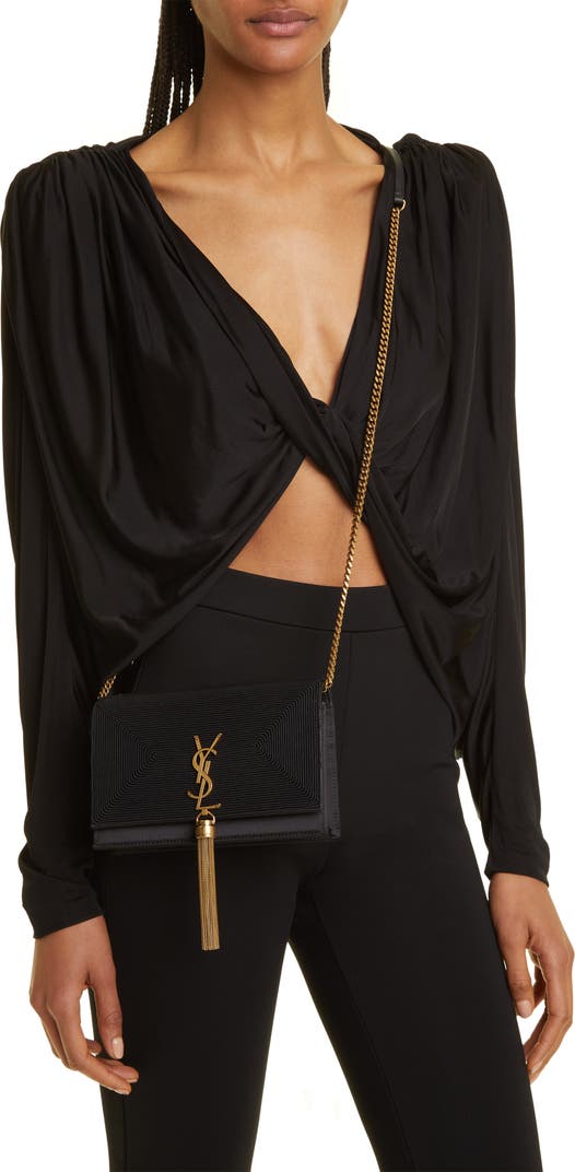 Expertly crafted in Italy, the SAINT LAURENT Kate Chain Bag in Nero offers both style and practicality. The ribbed textile exterior is accented with interlaced YSL hardware and a metal tassel for a touch of luxury. The foldover top with magnetic closure opens to reveal a main compartment with 6 card slots and a zipper compartment, while the detachable chainlink strap allows for versatile wear. Measures 8" W x 6" H x 1" D.