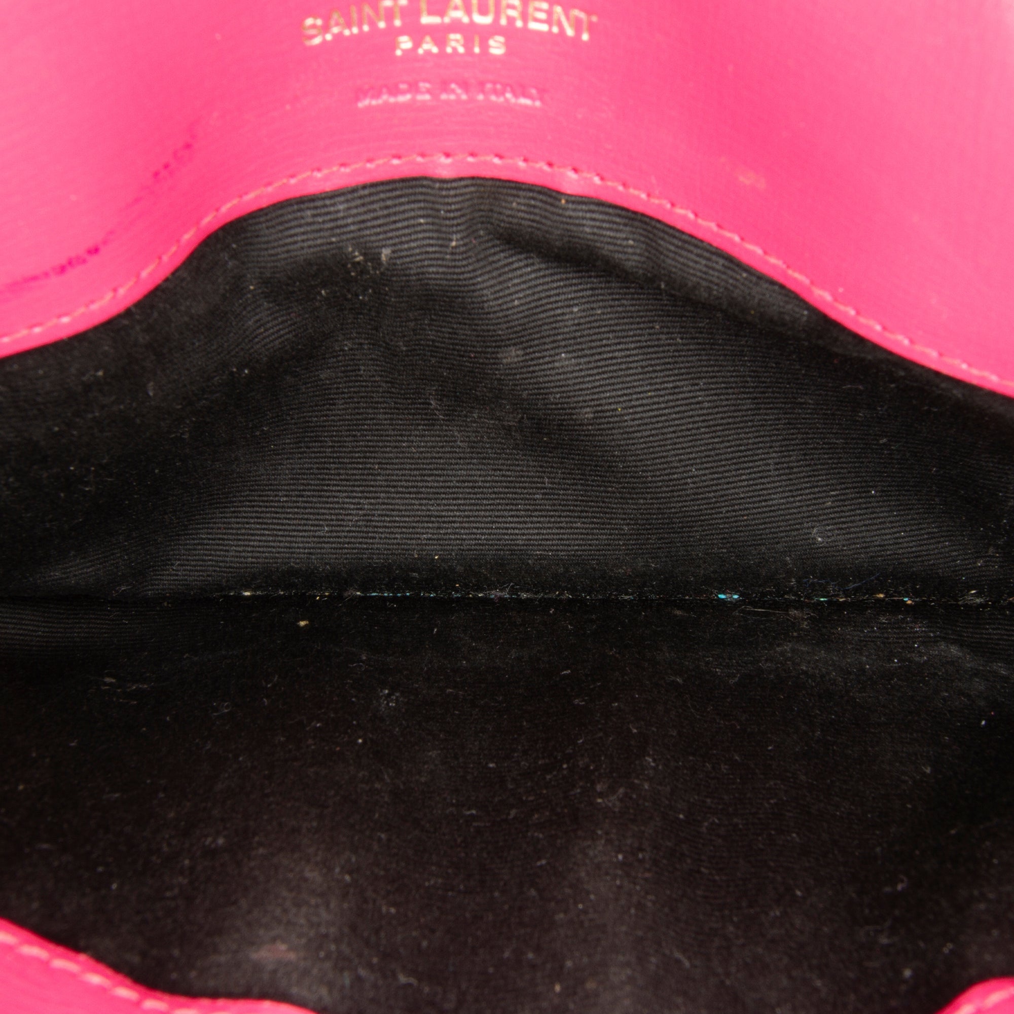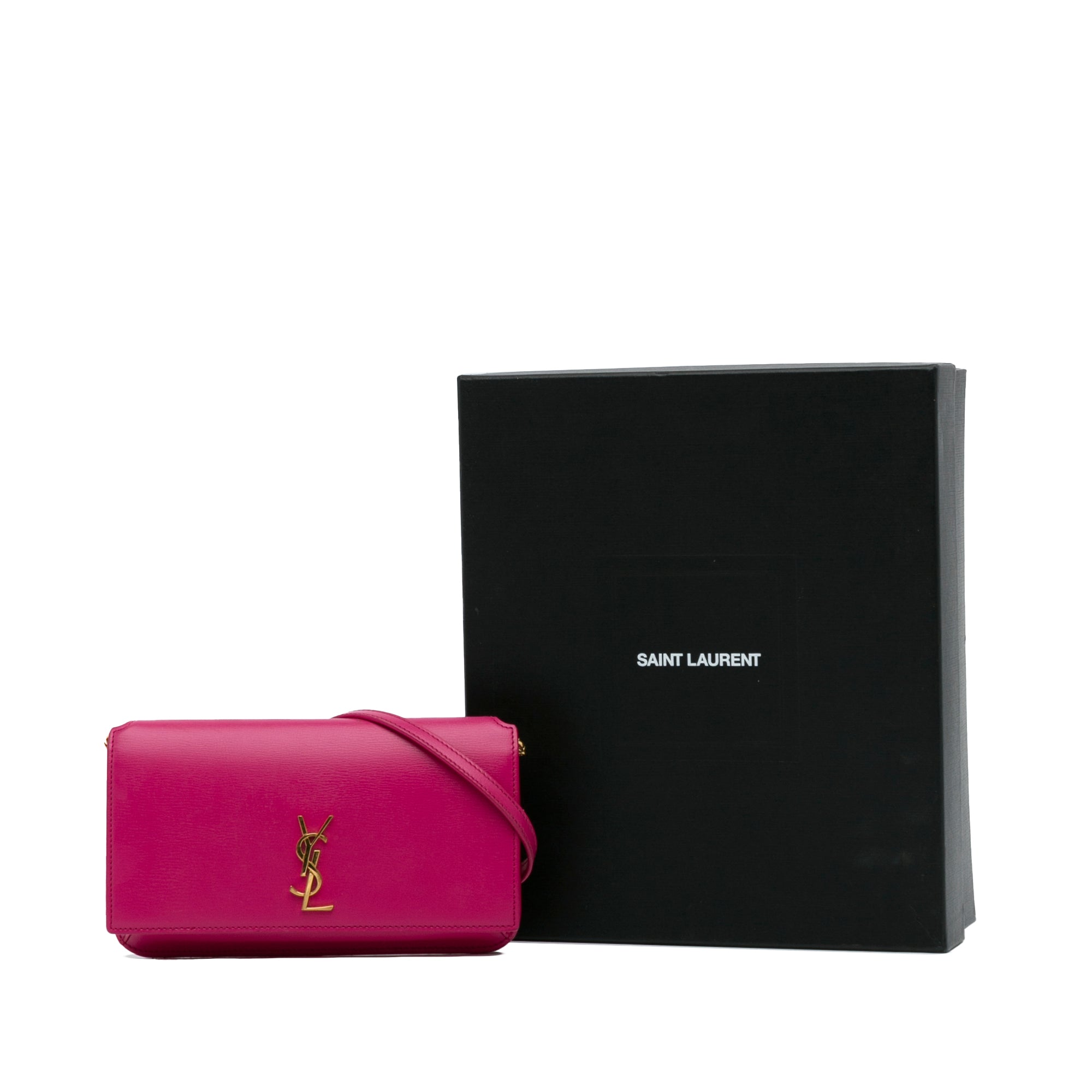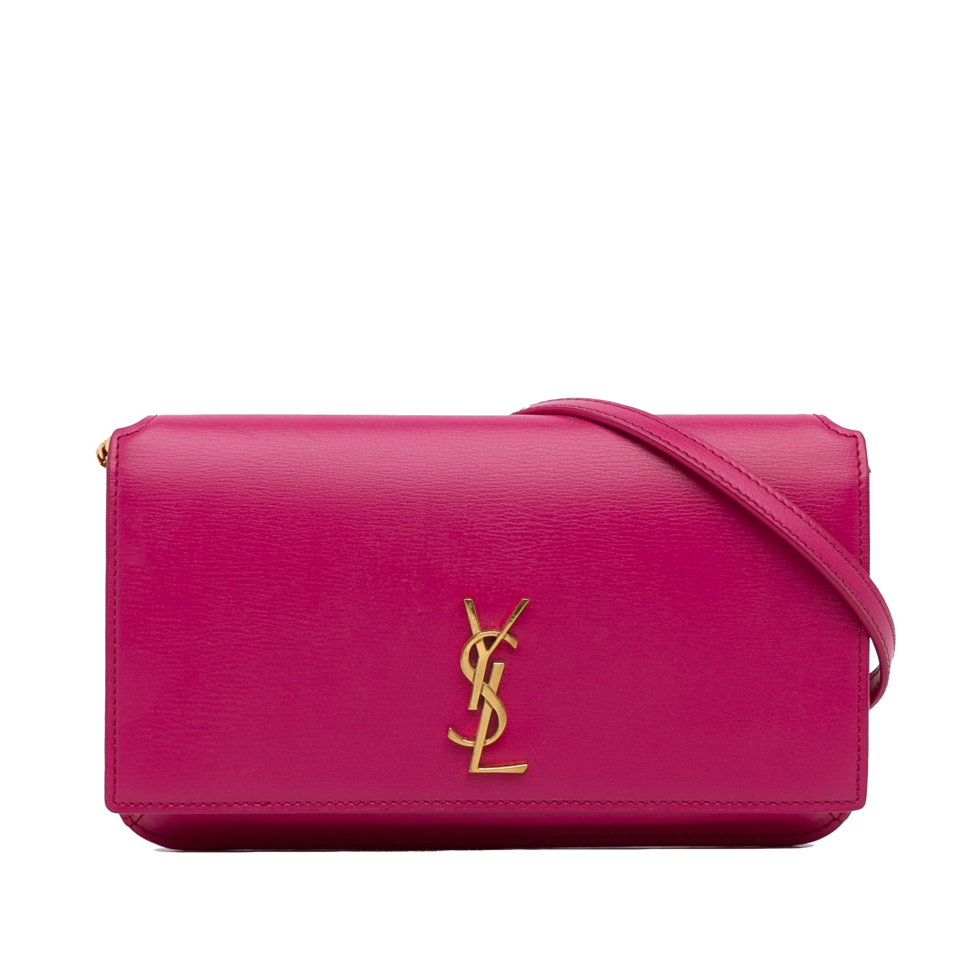 This Pre-Owned SAINT LAURENT Monogram Cassandre Phone Holder Crossbody is a chic and practical accessory for on-the-go. Crafted from pink leather and featuring golden hardware, this crossbody bag has a very good condition type, authenticated by real authentication.