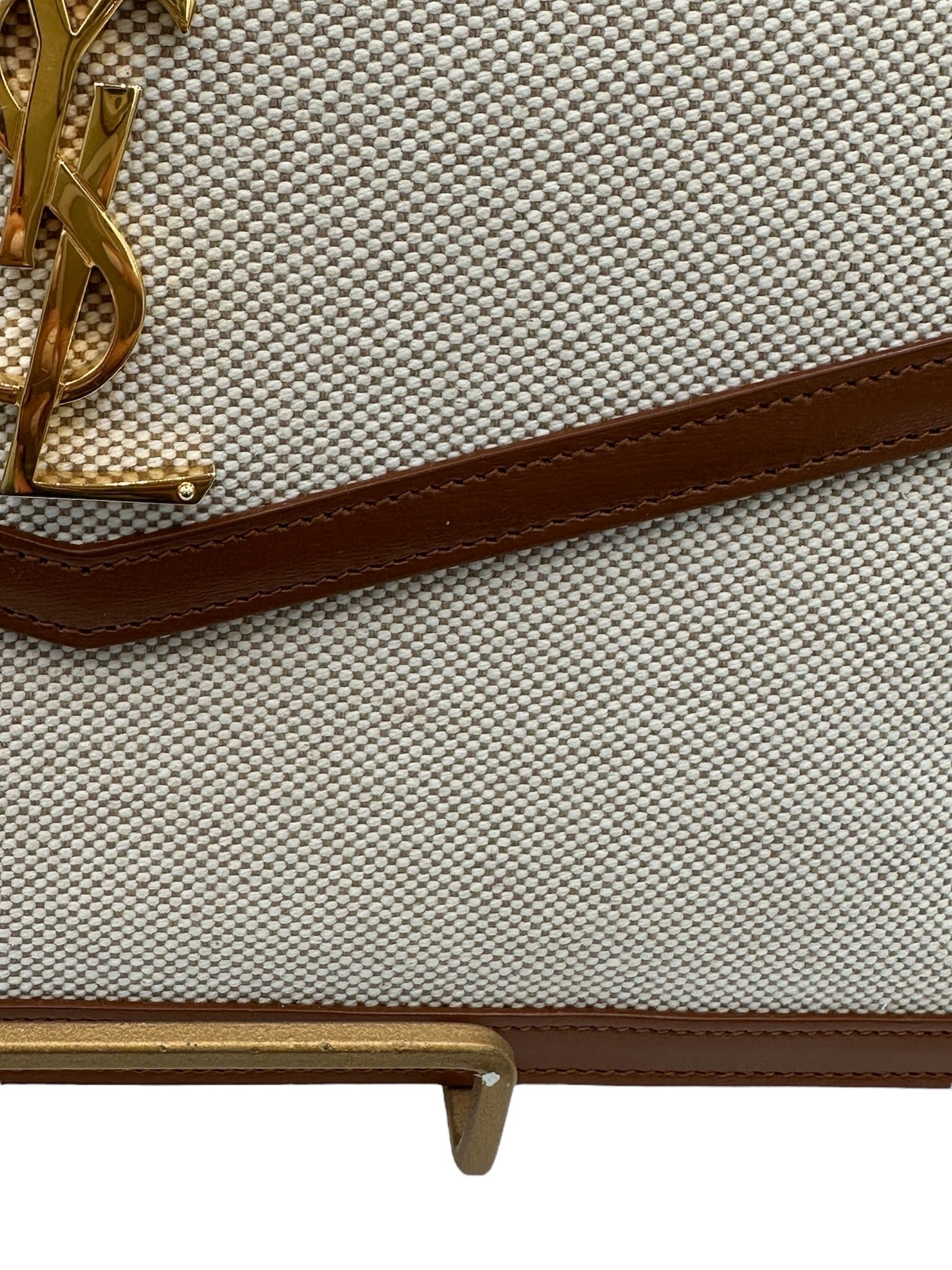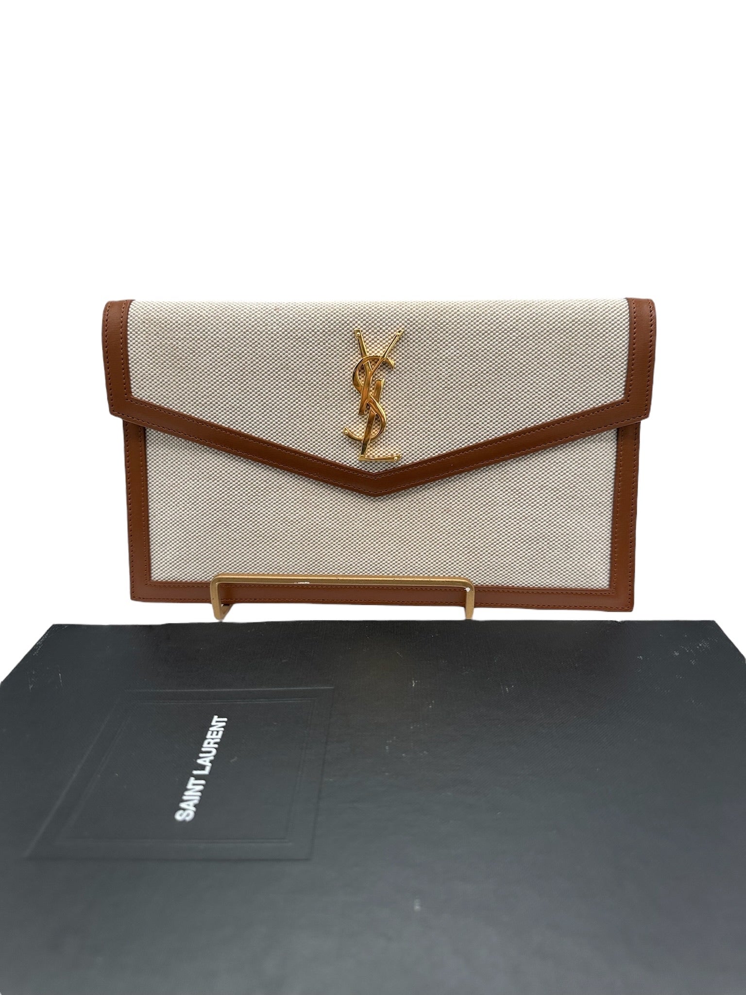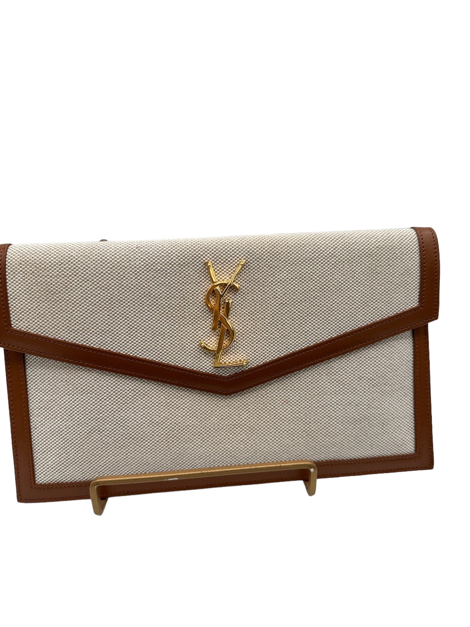 This pre-owned SAINT LAURENT Uptown Pouch in natural beige canvas is a chic small leather goods piece perfect for everyday use.