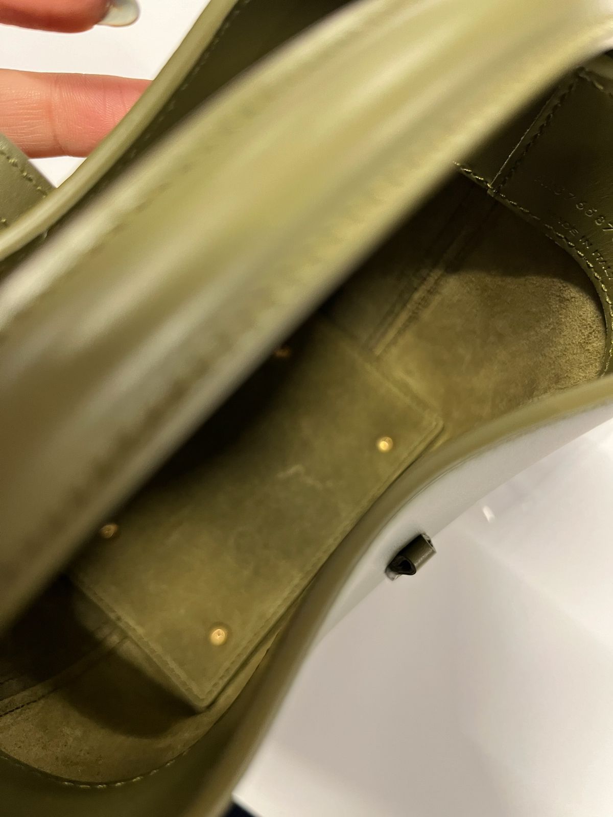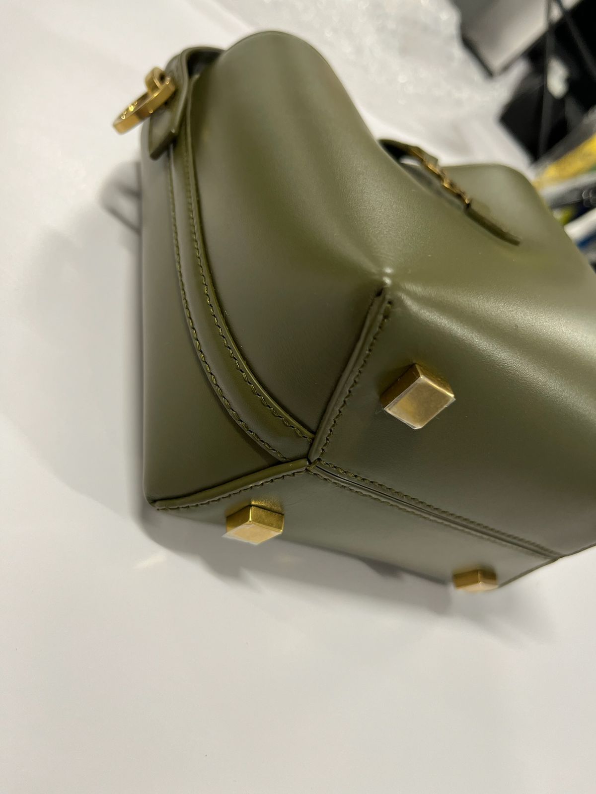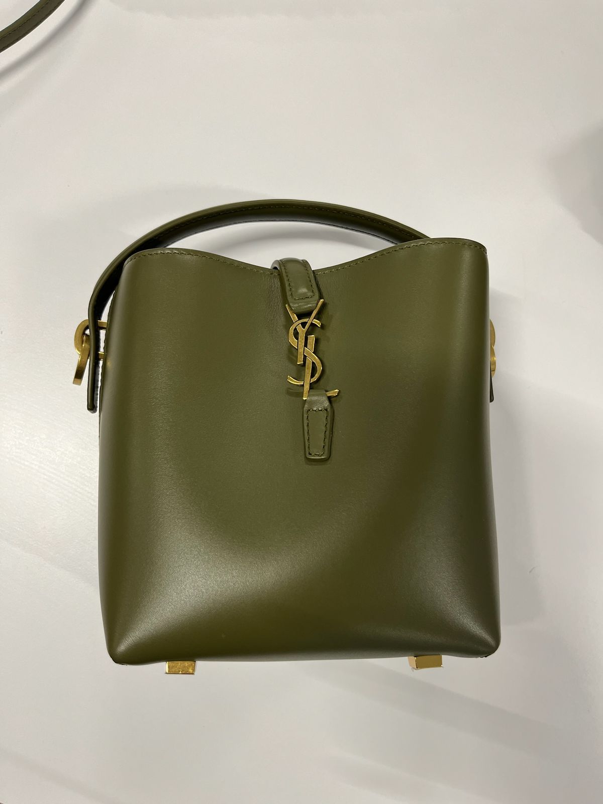 Introducing the SAINT LAURENT Olive Smooth Leather Mini Le 37 Bucket Bag - a sleek and stylish accessory to elevate any outfit! Made from smooth leather and in excellent condition, with only small signs of wear, this elegant bag is perfect for the fashion-forward individual. Add it to your collection today!