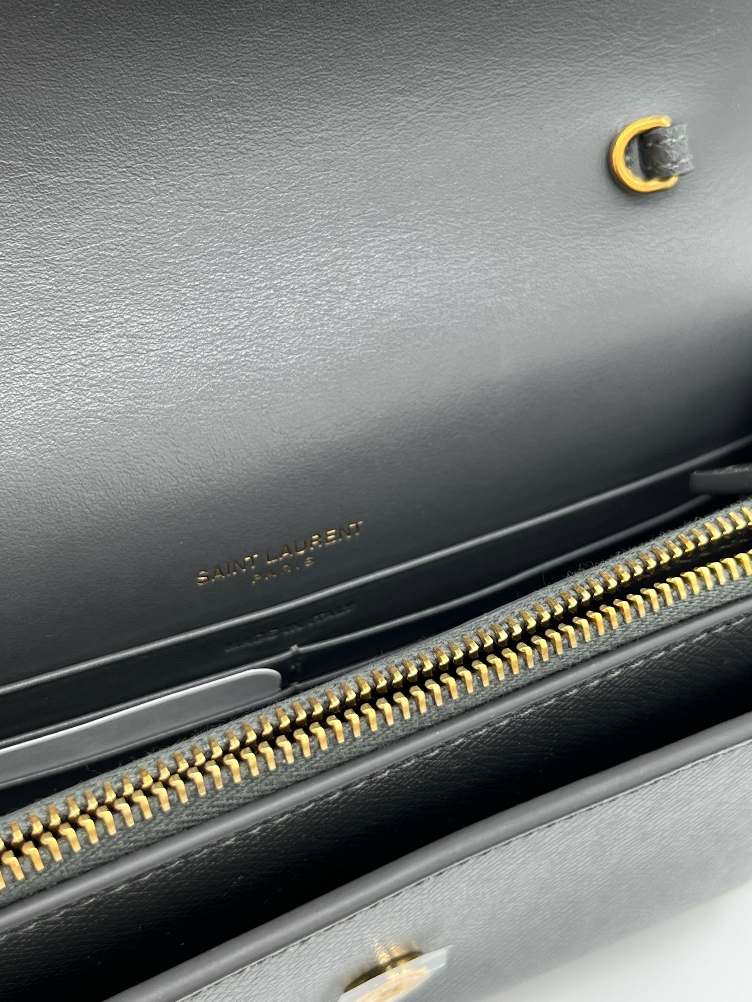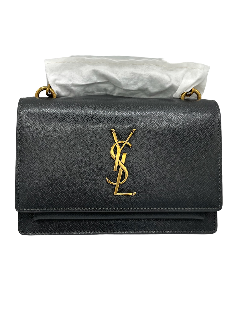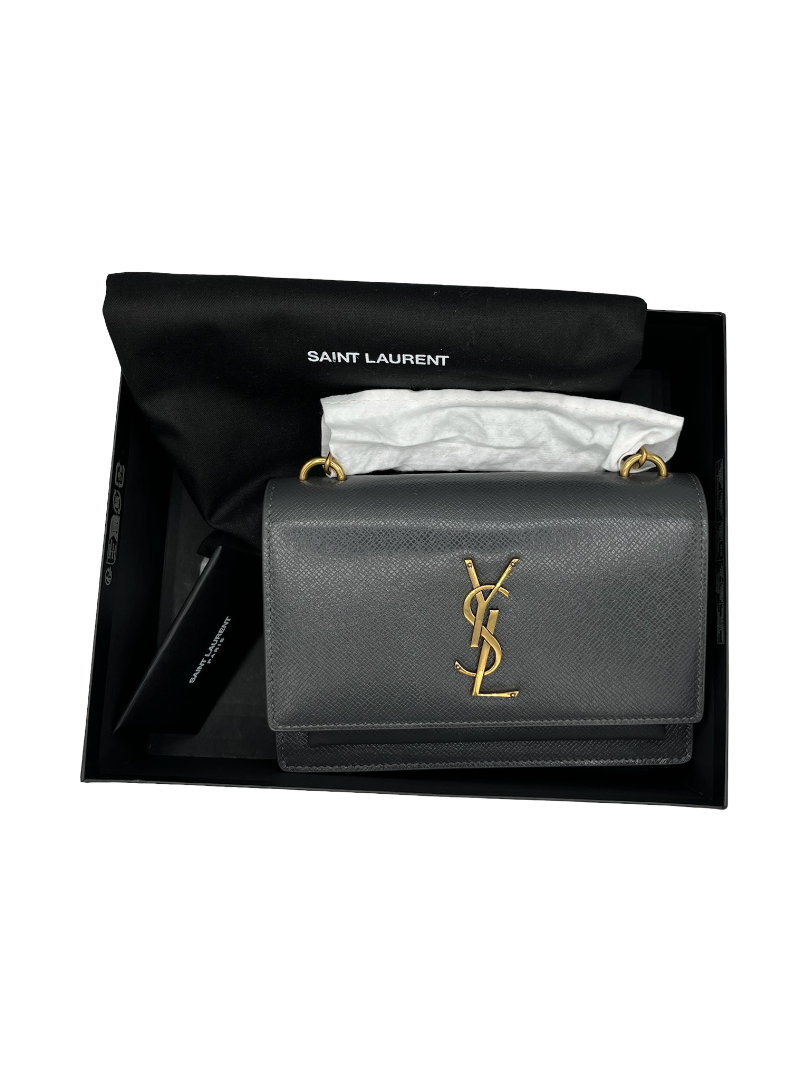 This Pre-Owned SAINT LAURENT Sunset Chain Wallet in Coated Bark Leather is the perfect accessory for any fashion-forward individual looking for a sleek and sophisticated crossbody bag.
