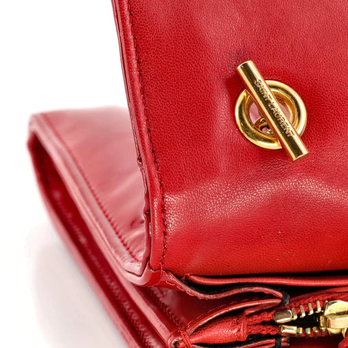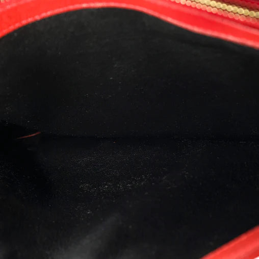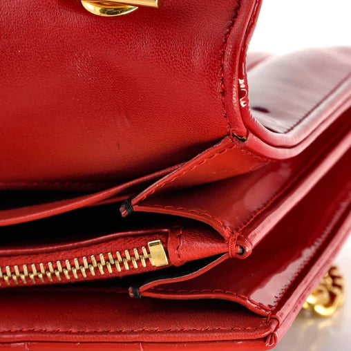 This used SAINT LAURENT wallet is made with a red patent leather exterior and a black interior with a combination of fabric and leather. Gold hardware finish and a dust bag complete the look. Its interior odor is balanced, while the exterior shows creasing, wear, marks, scuffs, and glitter. Additionally, it has indentations underneath the flap, and wear and marks in the interior. Hardware has scratches, tarnish, and discoloration.